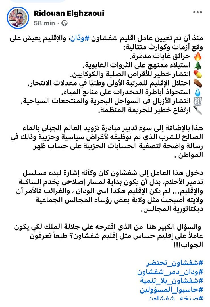 ولم يتردد الباحث في تدوينته بالقول إن دخول العامل الحالي إلى شفشاون كان بمثابة “إشارة لبدء مسلسل تدمير الأحلام”، متهماً إياه بانتهاج أسلوب في التسيير شبيه بما سماه “ديكتاتورية بعض رؤساء المجالس الجماعية”، بدل أن يكون رمزاً للحكامة الجيدة والفعالية الترابية.